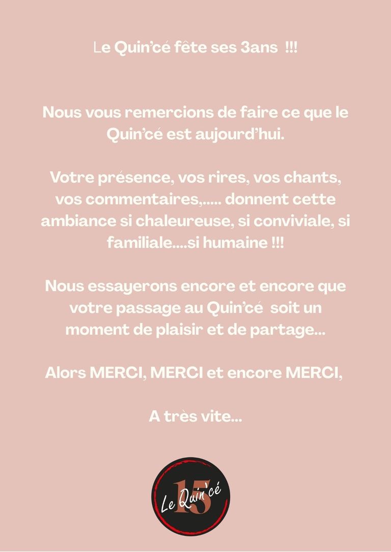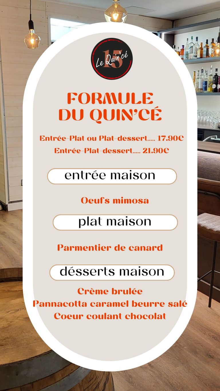 Le Quin'cé est un restaurant à ambiance chaleureuse, conviviale, et familiale. Vous pourrez vous régaler avec une cuisine faite maison, de l'entrée au dessert. Une restauration sur place mais également à emporter et cela toute la journée !!!